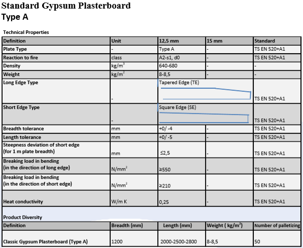 Should be stored horizontally on a flat surface, in dry conditions, and on pallets to avoid contact with water. Up to five pallets can be stacked on top of one another. While palletizing, both gypsum plasterboards should be placed so as to protect their front surfaces. If the gypsum plasterboard varieties are to be stocked outdoors, the pallets should be covered with material such as nylon, etc.